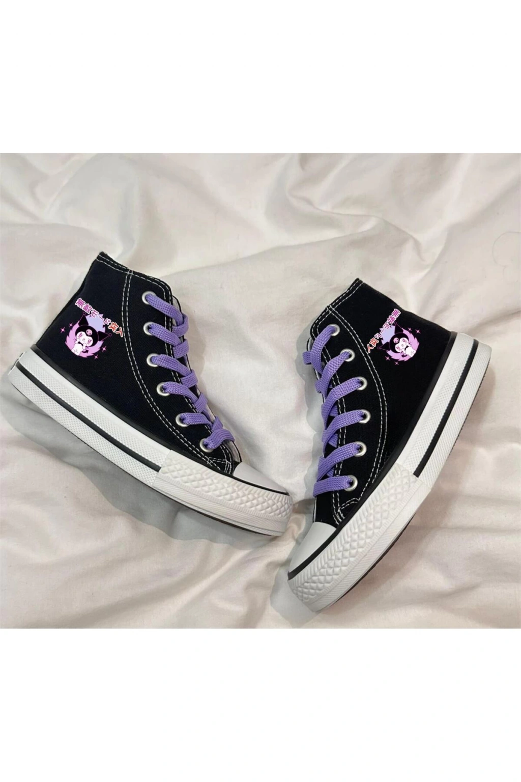 - Çocukların enerjisini yansıtan Çince Kuromi baskısı ile dikkat çeken bu spor ayakkabı, çocukların tarzını tamamlar.; - Lila bağcıkları sayesinde kolayca giyilip çıkarılabilir ve çocukların rahat hareket etmesine olanak tanır.; - Siyah bilek kısmı, hem şık bir görünüm sağlar hem de ayakkabının ayağa tam oturmasını destekler.; - Kısa topuklu tasarımı (1-4 cm) ile çocukların günlük kullanımına uygun konfor sunar; uzun süre ayakta kalırken bile rahatlık hissi verir.; - Kadın / kız yaş grubuna hitap eden bu sneaker, hem kız çocuklarının hem de erkek çocuklarının beğenisine sunulmuştur.