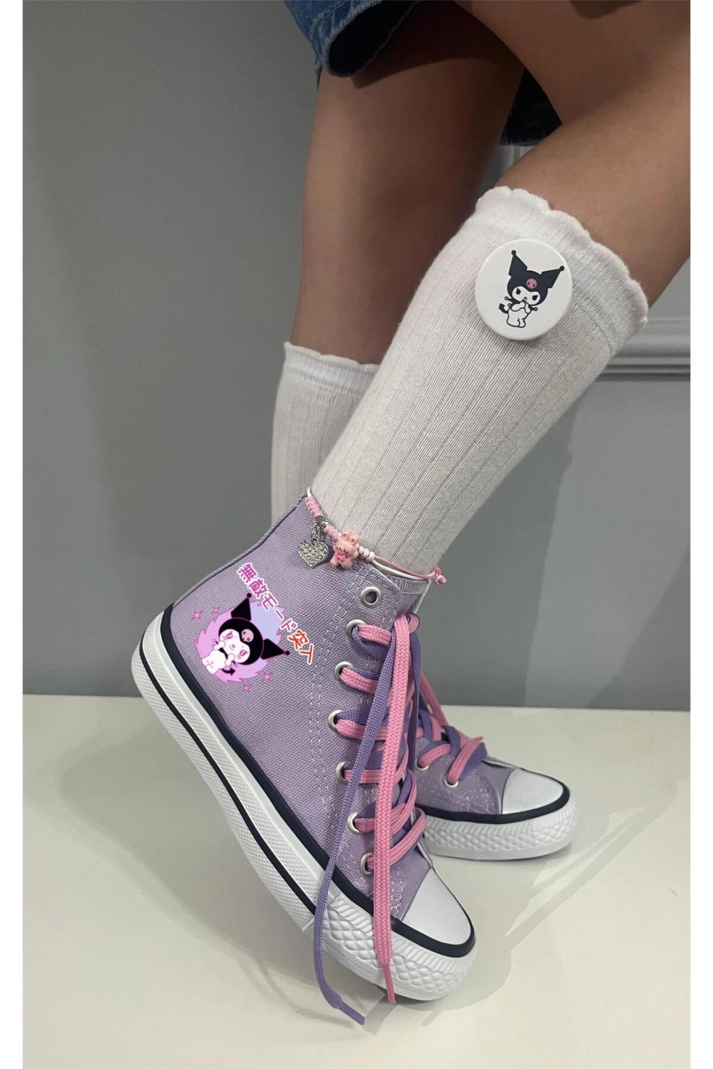 Çince Kuromi Baskılı, Lila&Pembe Bağcıklı, Lila Bilekli Spor Ayakkabı, Çocuk Sneaker