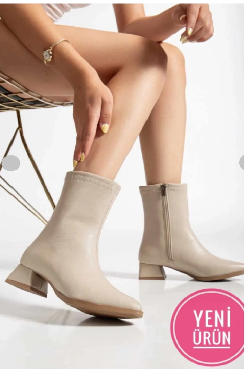 Nude Kadın Topuklu Bot | Günlük ve Şık Kısa Topuklu Fermuarlı Bot | Yeni Sezon Moda Ayakkabı Boots