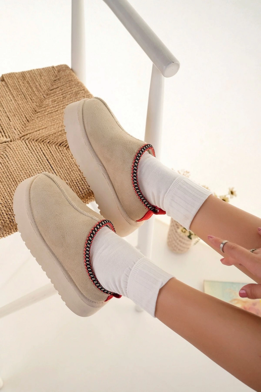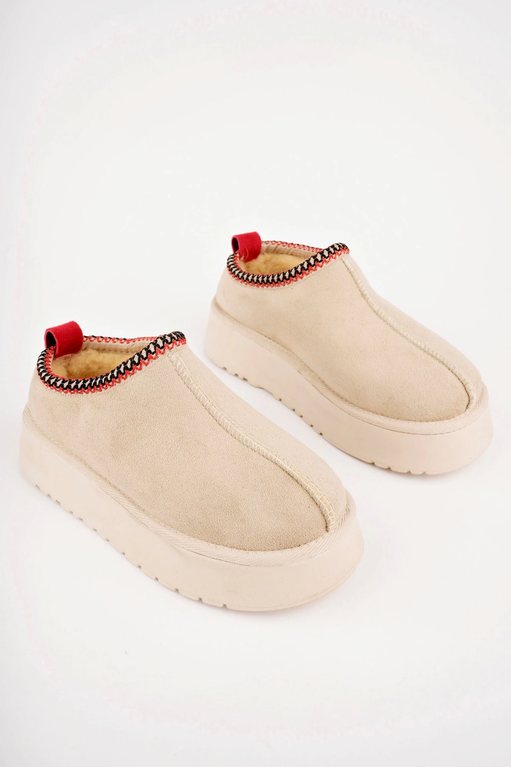 Kadın Bej Süet Düz Kürklü Mini Yarım Bot