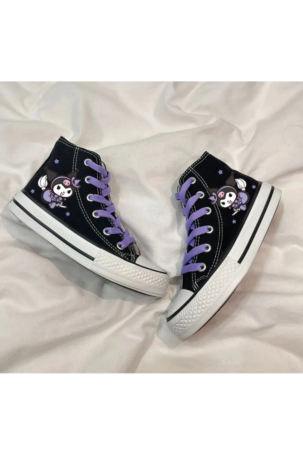 Kuromi Baskılı, Lila Bağcıklı, Siyah Bilekli Spor Ayakkabı Çocuk Sneaker