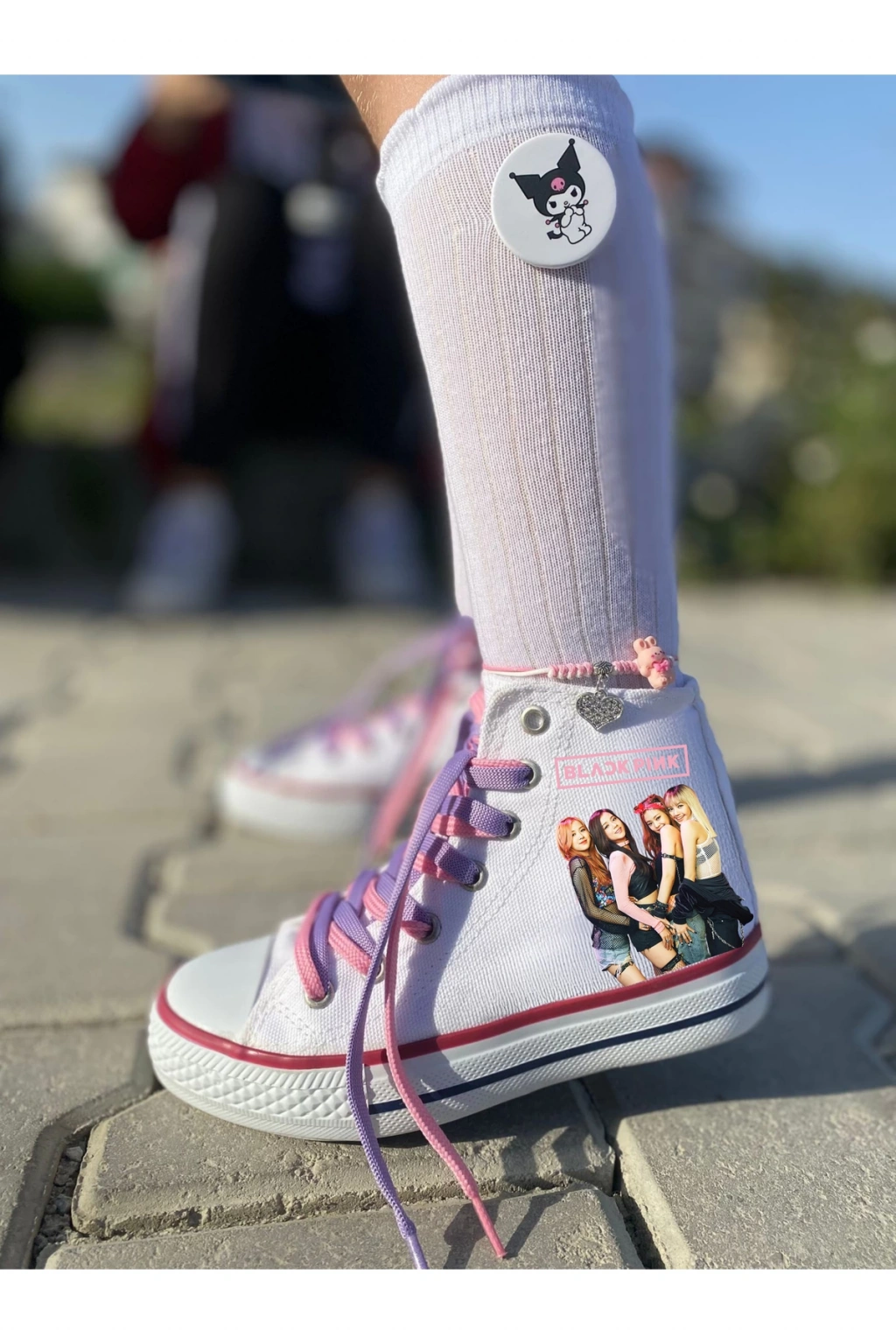 Lila&Pembe Bağcıklı, Black Pink Baskılı, Beyaz Bilekli Spor Ayakkabı Çocuk Sneaker