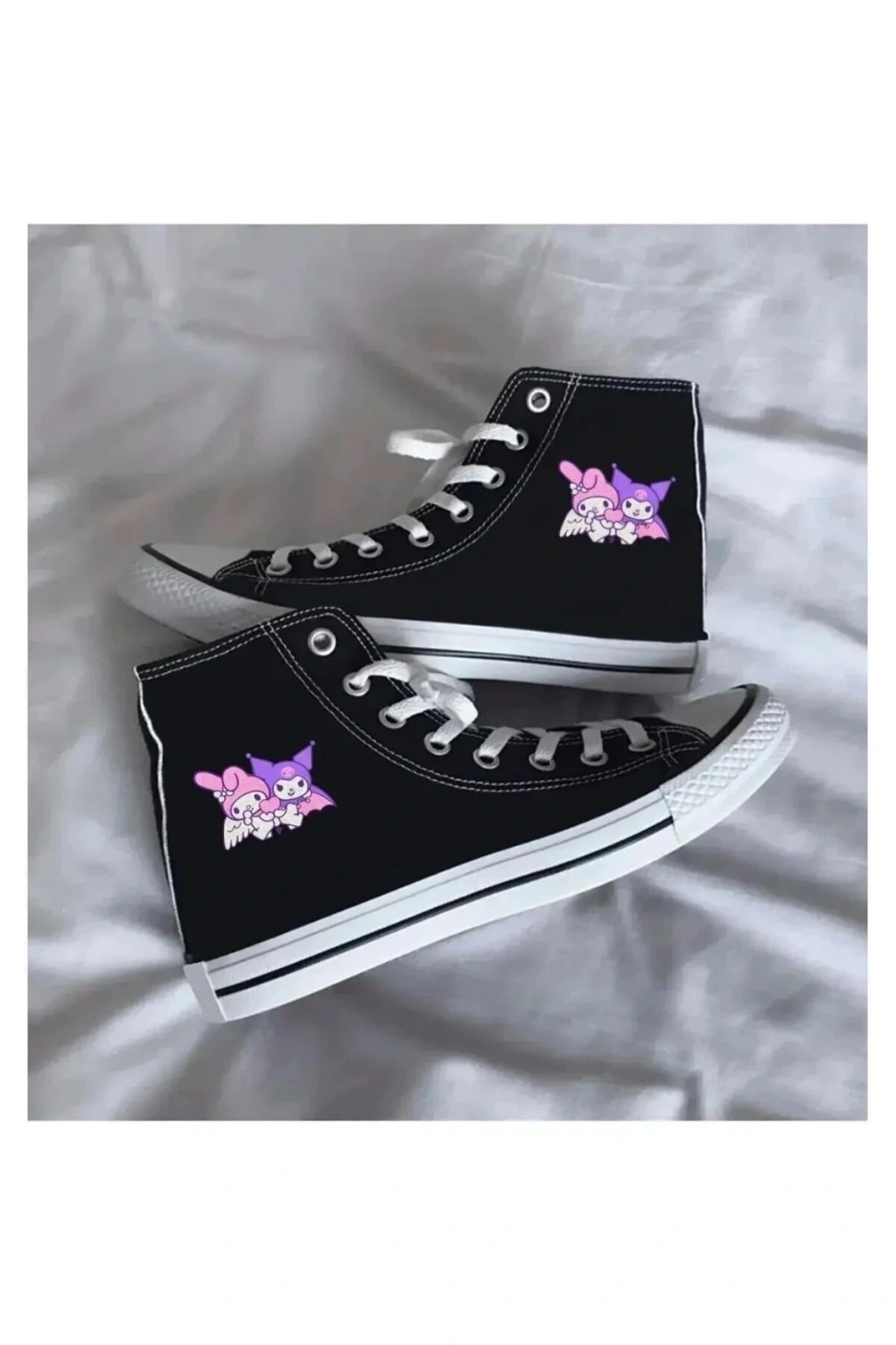 - Kuromi temalı siyah bilekli spor ayakkabı, çocukların enerjisini yansıtan eğlenceli tasarımıyla dikkat çeker.; - Kısa topuklu yapısı (1-4 cm) ile rahatlık ve konfor sunar, günlük kullanım için idealdir.; - Kadın/kız çocukları için özel olarak tasarlanmış bu sneaker, gençlerin tarzını tamamlar.; - Dokuma kumaş tipi sayesinde dayanıklılığı artırırken, tekstil astarı ayakların nefes almasına olanak tanır.; - Kauçuk taban materyali ile kaymaz özellik sağlayarak güvenli adımlar atmanızı destekler.; - Casual/günlük ortamlarda rahatlıkla tercih edebileceğiniz bu ayakkabı, her türlü kıyafetle uyum sağlar.; - Baskılı deseniyle göze hitap ederken, düz tabanlı yapısı uzun süreli kullanımda konfor sunar.; - Bağcıklı bağlama şekli pratik giyip çıkarmayı mümkün kılar; böylece çocuklar kendi ayakkabılarını kolayca kendileri giyebilirler.; - Ek özellik bulunmayan bu modelde sürdürülebilirlik detayına yer verilmemiştir ancak kaliteli malzemelerden üretilmiştir.; - Yıkama talimatlarına uygun şekilde bakım yapıldığında uzun ömürlü kullanım vaad eder.