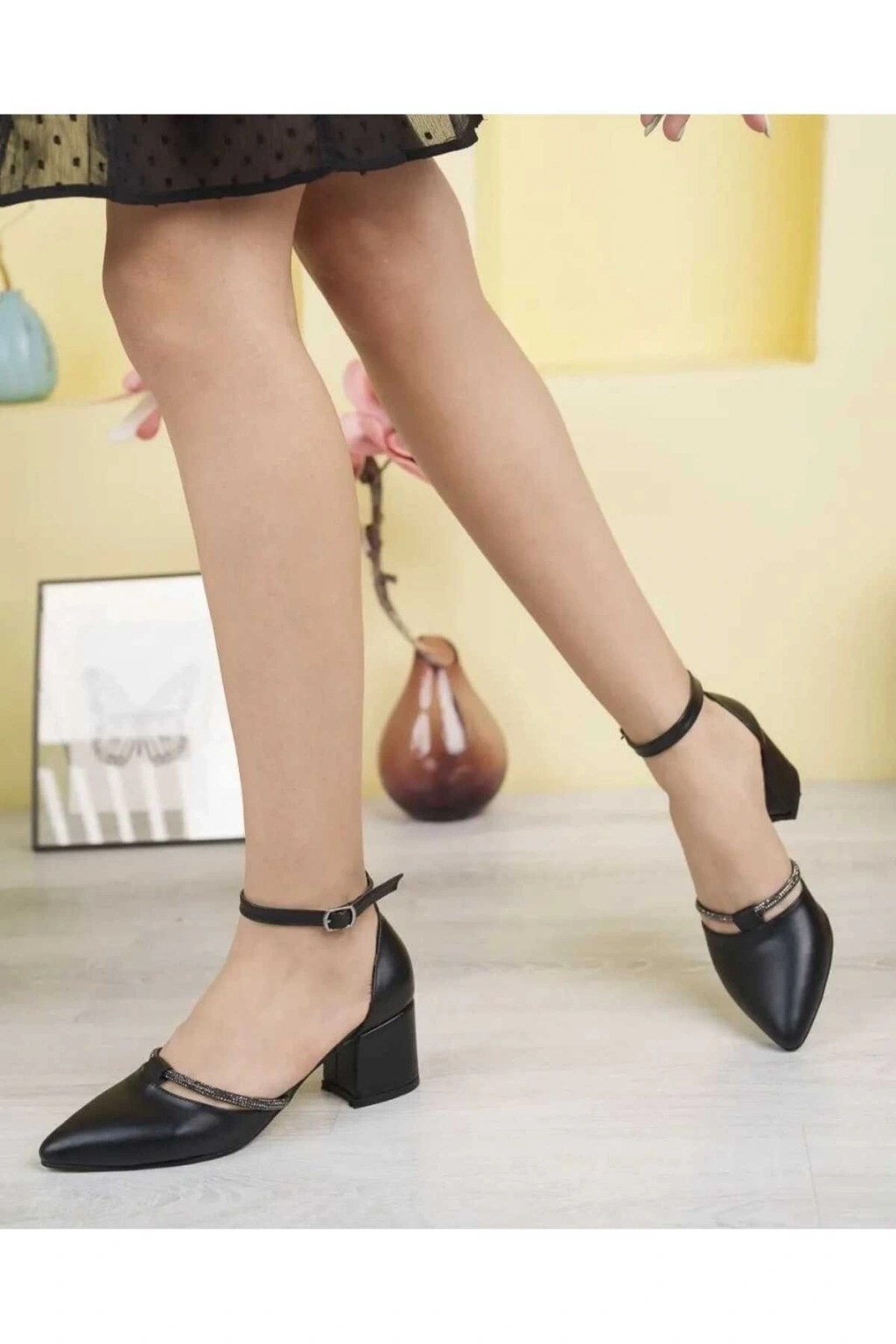Siyah k Cilt Kadın Taşlı Topuklu Ayakkabı 7 PUNT
