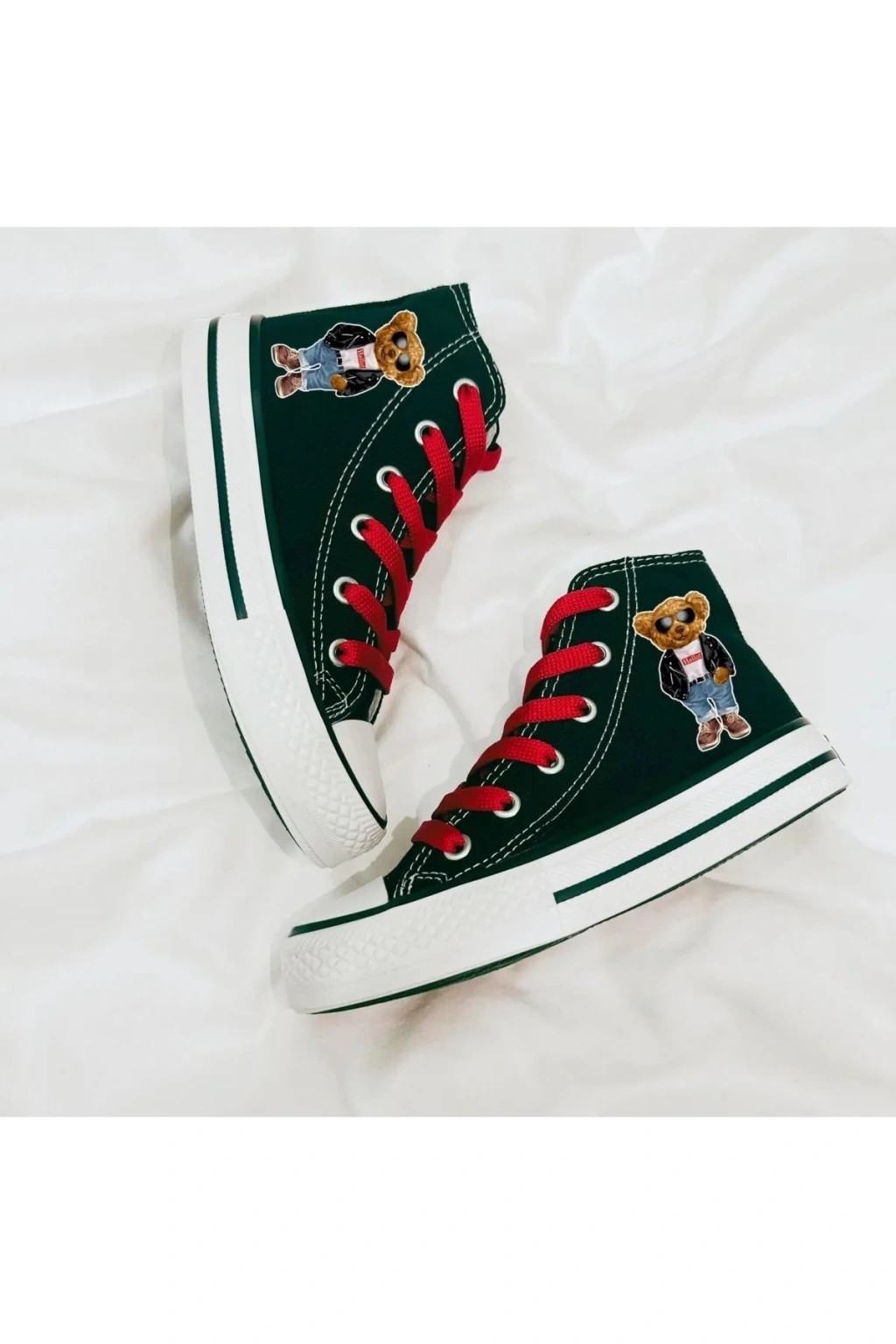 Teddy Bear Ayıcık Baskılı, Kırmızı Bağcıklı, Siyah Bilekli Spor Ayakkabı Çocuk Sneaker